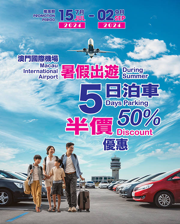 澳門機場宣佈,暑假期間凡於機場出遊的旅客可享最多連續五日的泊車半價優惠。