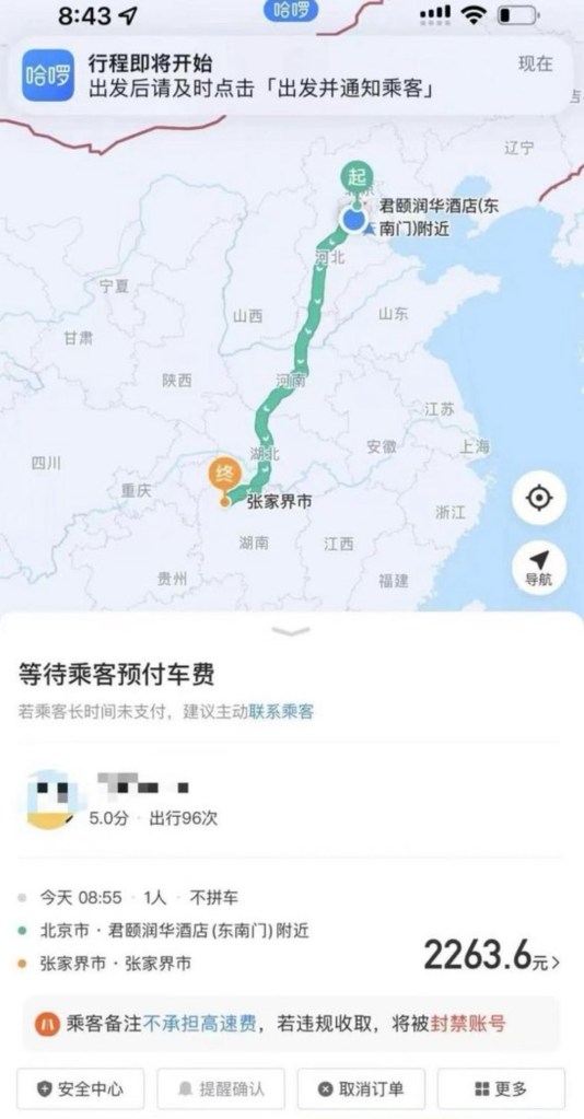 內地一名男子在北京乘坐1,400公里順風車,上車後就取消了訂單,到達目的地、湖南慈利縣後更「走數」消失。