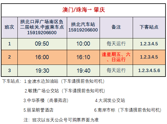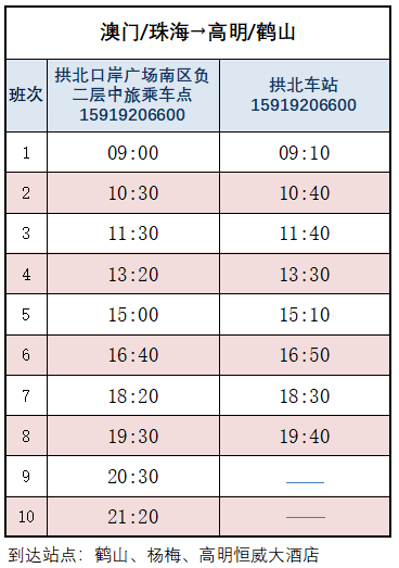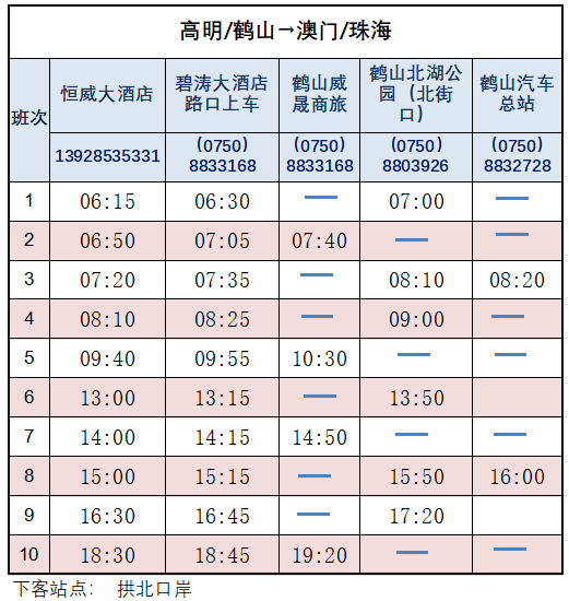 為方便澳門、高明、鶴山的乘客出行,中旅跨境巴士今日起增加鶴山北湖公園(北街口)、鶴山汽車總站兩個上車站,班次如下: