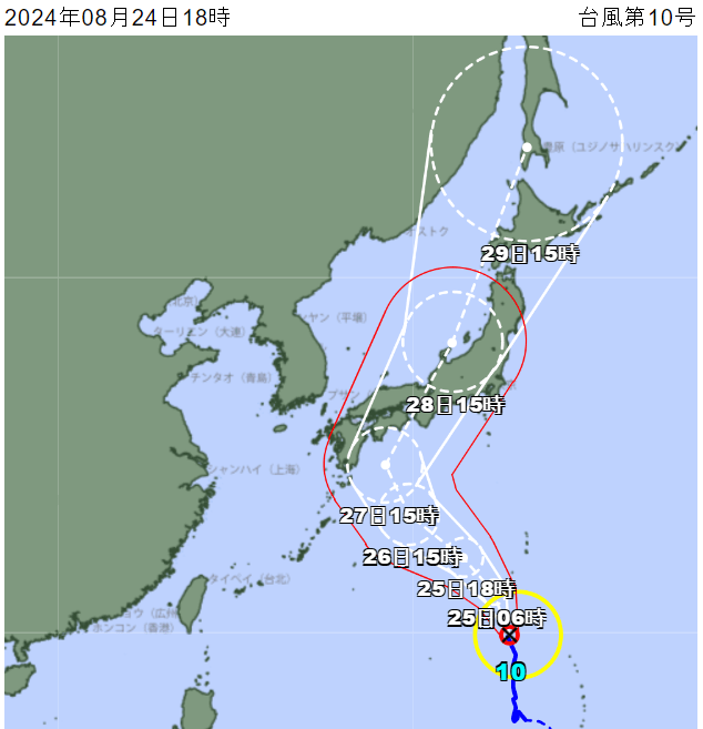 根據tenki報導,珊珊會持續增強並往北方移動,27日就會以「非常強烈的勢力」靠近日本,預計28日從關東至四國之間登陸,同時也有可能穿越本州與北海道地區。不過颱風路徑仍可能出現變化。