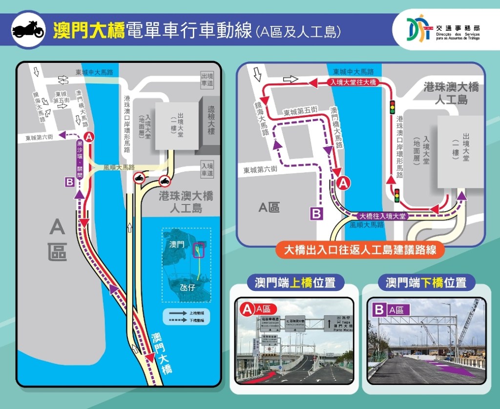 澳門大橋設有電單車專道,電單車可由新城A區澳門橋大馬路、經北安大馬路前往氹仔,而氹仔至新城A區方向,可經北安大馬路(往碼頭方向)左轉前往電單車專道;而偉龍馬路、北安碼頭來車則必須行經偉龍馬路行車天橋至地面掉頭,最後經澳門橋大馬路抵達新城A區。