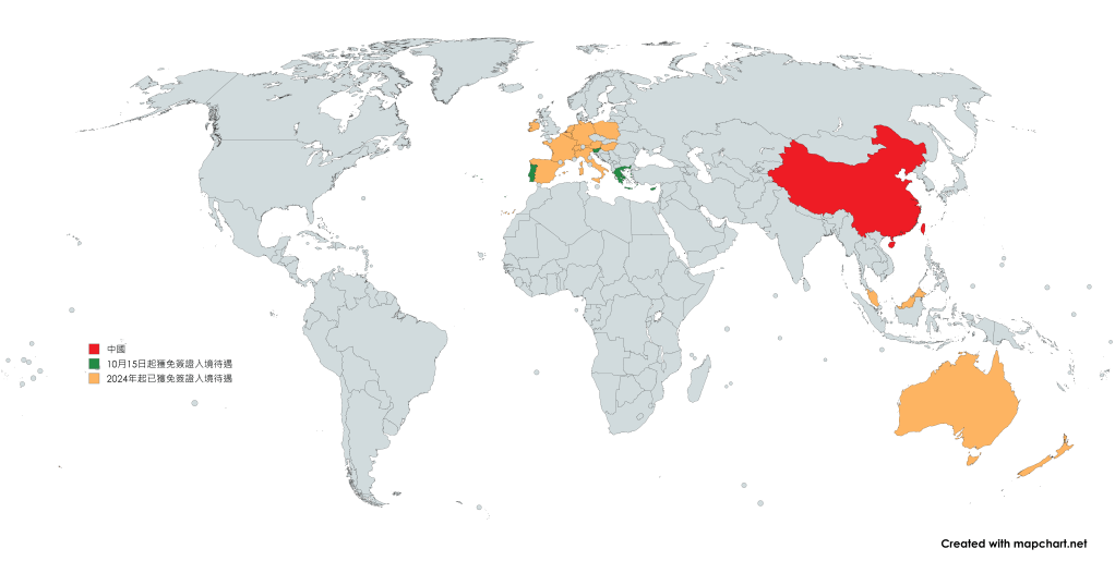 2024年10月15日至2025年12月31日期間,上述國家持普通護照人員來華經商、旅遊觀光、探親訪友和過境不超過十五日,可免簽入境。不符合免簽條件人員仍需在入境前辦妥來華簽證。