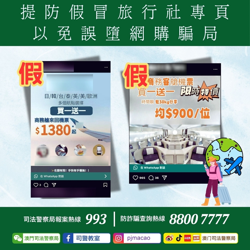 節假日在即,司法警察局發出警情通告,呼籲市民提防假冒旅行社專頁,切勿盲目相信遠低於市場價格的網上平台廣告。