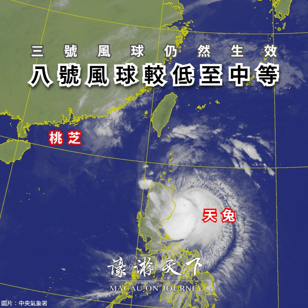 按照現時預測路徑,熱帶氣旋「桃芝」將於今日日間在本澳以南約150公里外掠過,其後轉向西南方向移動。
