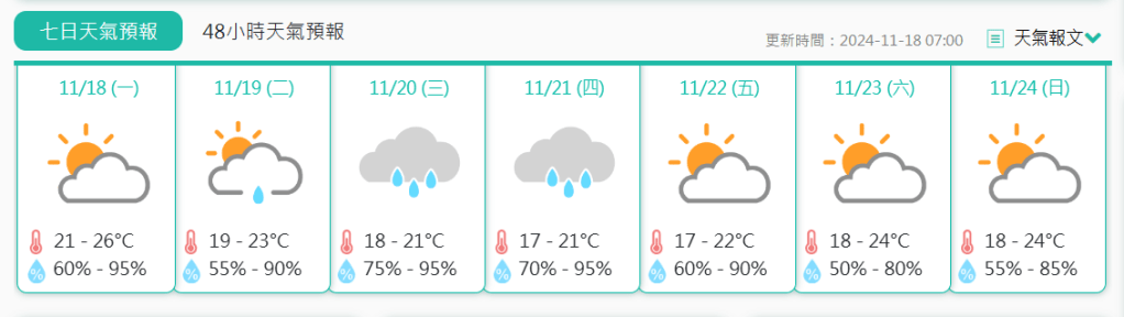 氣象局預測本澳今日多雲,短暫時間有陽光,有一兩陣驟雨。吹四至五級偏北風,間中六級及有陣風。氣溫約為攝氏21至26度。相對濕度介乎百分之60至95之間。預測最高紫外線指數約為6,級別屬於高。明日氣溫略降。多雲,短暫時間有陽光,稍後有幾陣雨。吹五至六級偏北風及有陣風。氣溫約為攝氏19至23度。相對濕度介乎百分之55至90之間。至周四氣溫將進一步降至最低攝氏17度。