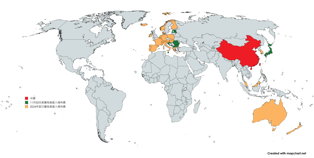 自今年起中國已經向馬來西亞、澳洲、紐西蘭和包括法國、德國、西班牙、義大利等多個神根國家單方面推出免簽政策。不過,神根區部份國家,包括捷克、瑞典和立陶宛,以及歐洲經濟區內的英國,仍未被中方列入免簽證入境國家的範圍內。