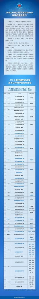 全面放寬優化後的240小時過境免簽政策進一步擴大了停留活動區域。政策適用省份由原有的北京、天津、河北、遼寧、黑龍江、上海、江蘇、浙江、福建、山東、河南、湖北、湖南、廣東、廣西、重慶、四川、雲南、陝西十九個省(區、市)增加山西、安徽、江西、海南、貴州五省,合計二十四個省(區、市)。新增的五省中,過境免簽人員在安徽、海南、貴州三省停留活動區域為全省,在山西省停留活動區域為太原、大同市,在江西省停留活動區域為南昌、景德鎮市。將福建、湖北、陝西三省停留活動區域擴大至全省,廣西壯族自治區停留活動區域擴大至南寧、柳州、桂林、梧州、北海、防城港、欽州、貴港、玉林、賀州、河池、來賓12市行政區域。通過過境免簽政策來華的外國人可在上述二十四個省(區、市)允許停留活動區域內跨省域旅行。