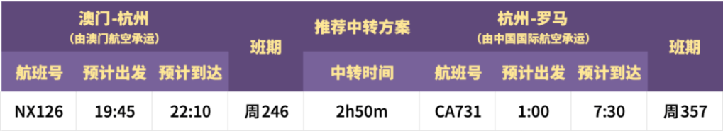 澳門出發前往羅馬為夜機去、早機到,而回程則為中午機去、黃昏返。中轉時間分別為兩個多小時及九個小時。杭州往返羅馬採用空中巴士A330-300客機。可惜的是去程每周只有三班,不及回程有彈性。