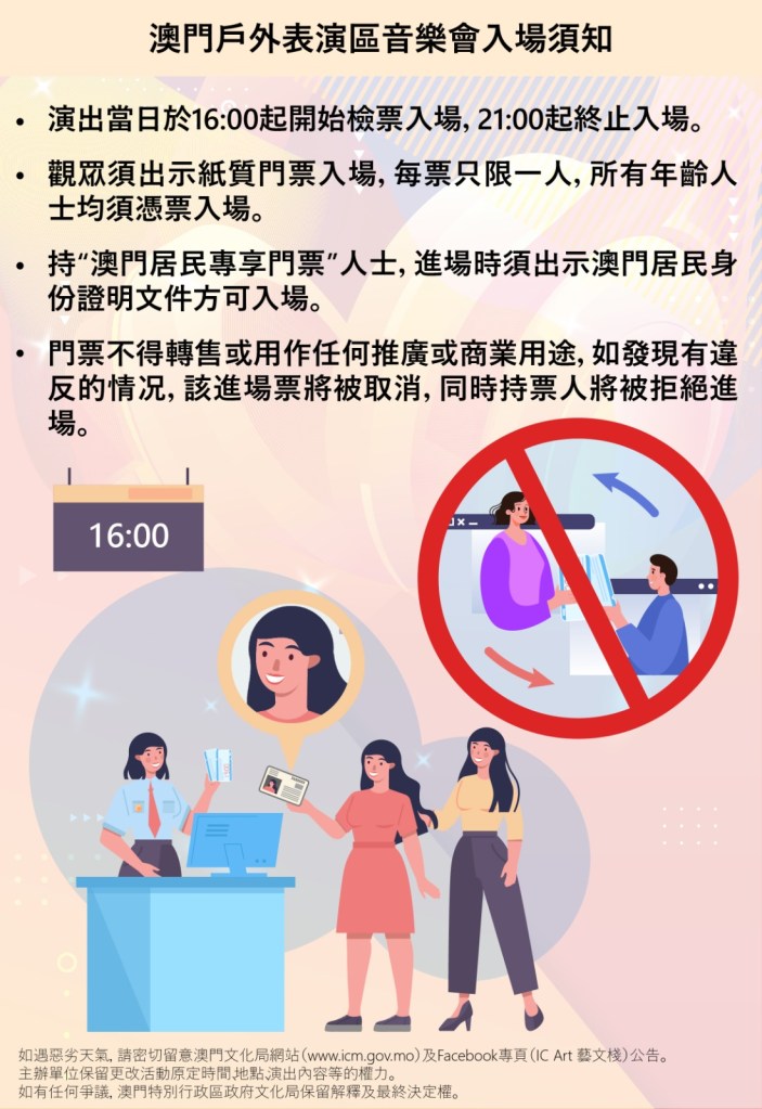 攻略, 活動, 澳門 戶外表演區首秀今晚舉行 當局公佈入場須知 下午四時起可入場 2024-12-28 濠遊天下 macauonjourney 發佈留言 澳門戶外表演區今晚將舉行首場音樂會。文化局晚上公佈了入場須知,下午四時開始驗票入場。 相關連結戶外表演區預熱音樂會明晚舉行 當局公佈臨時交通措施 分享此文: Share on X(在新視窗中開啟) X 分享到 Facebook(在新視窗中開啟) Facebook 喜歡 正在載入...