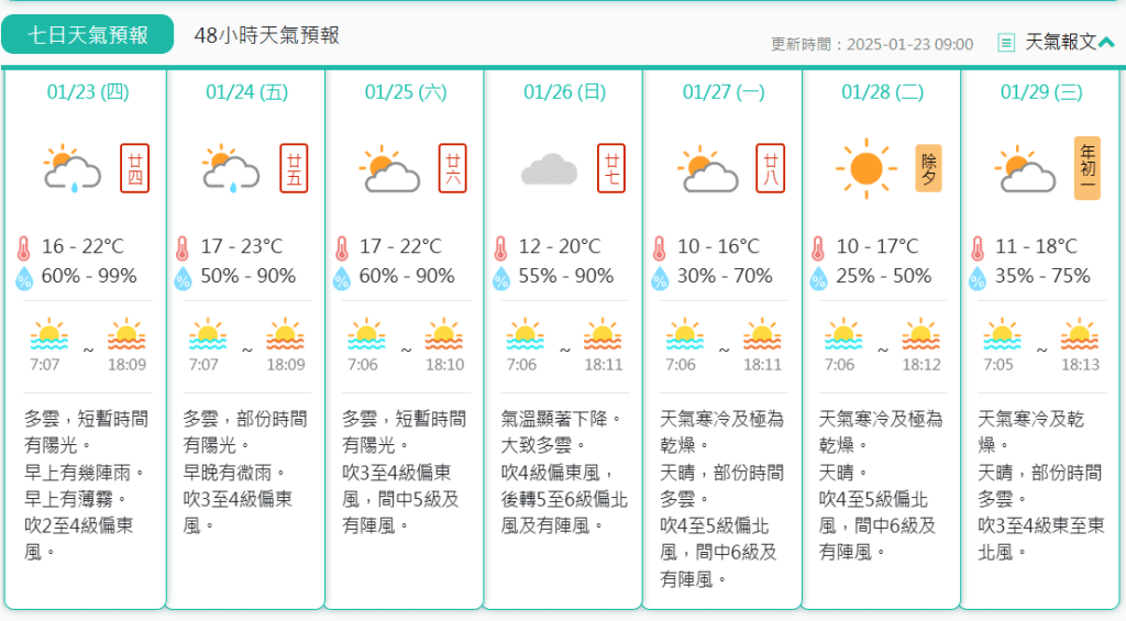 氣象局表示,一股強烈冬季季風星期日抵達華南沿岸,氣溫顯著下降,北風增強。下周初天氣寒冷及極為乾燥。氣象局預報,年廿八最低溫跌至10度,除夕及年初一氣溫介乎10至18度。