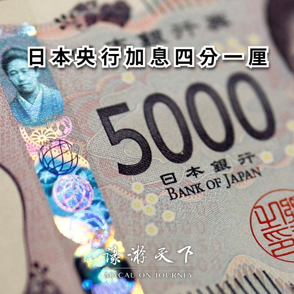 共同社報道,日本央行今日召開貨幣政策會議,決定進一步加息,將作為政策利率的「無擔保隔夜拆借利率」誘導目標從0.25%左右上調至0.5%左右。