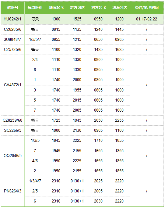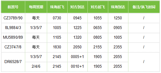 珠海—武漢航班時刻表