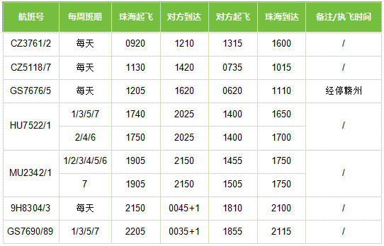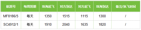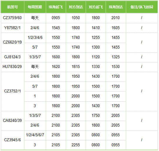 珠海—福州航班時刻表