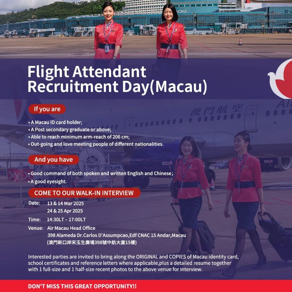 澳門航空將於3月13、14日,以及4月24、25日,下午二時半至五時,假澳門航空總部(澳門宋玉生廣場398號中航大廈15樓)舉行本地空中服務員招聘會。