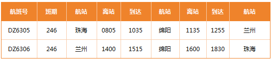 東海航空新增珠海=綿陽=蘭州航線,航班號DZ6305/6,逢星期二、四、六執飛。