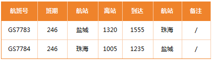 天津航空新增珠海=鹽城航線,航班號GS7783/4,逢星期二、四、六執飛。