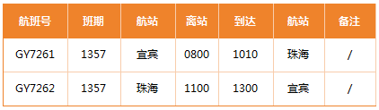 多彩貴州航空新增珠海=宜賓航線,航班號GY7261/2,逢星期一、三、五、七執飛。