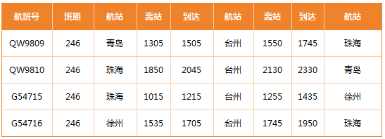 青島航空、華夏航空新增珠海=台州=青島、珠海=台州=徐州航線,航班號分別為GY7261/2、G54715/6,逢星期二、四、六執飛。