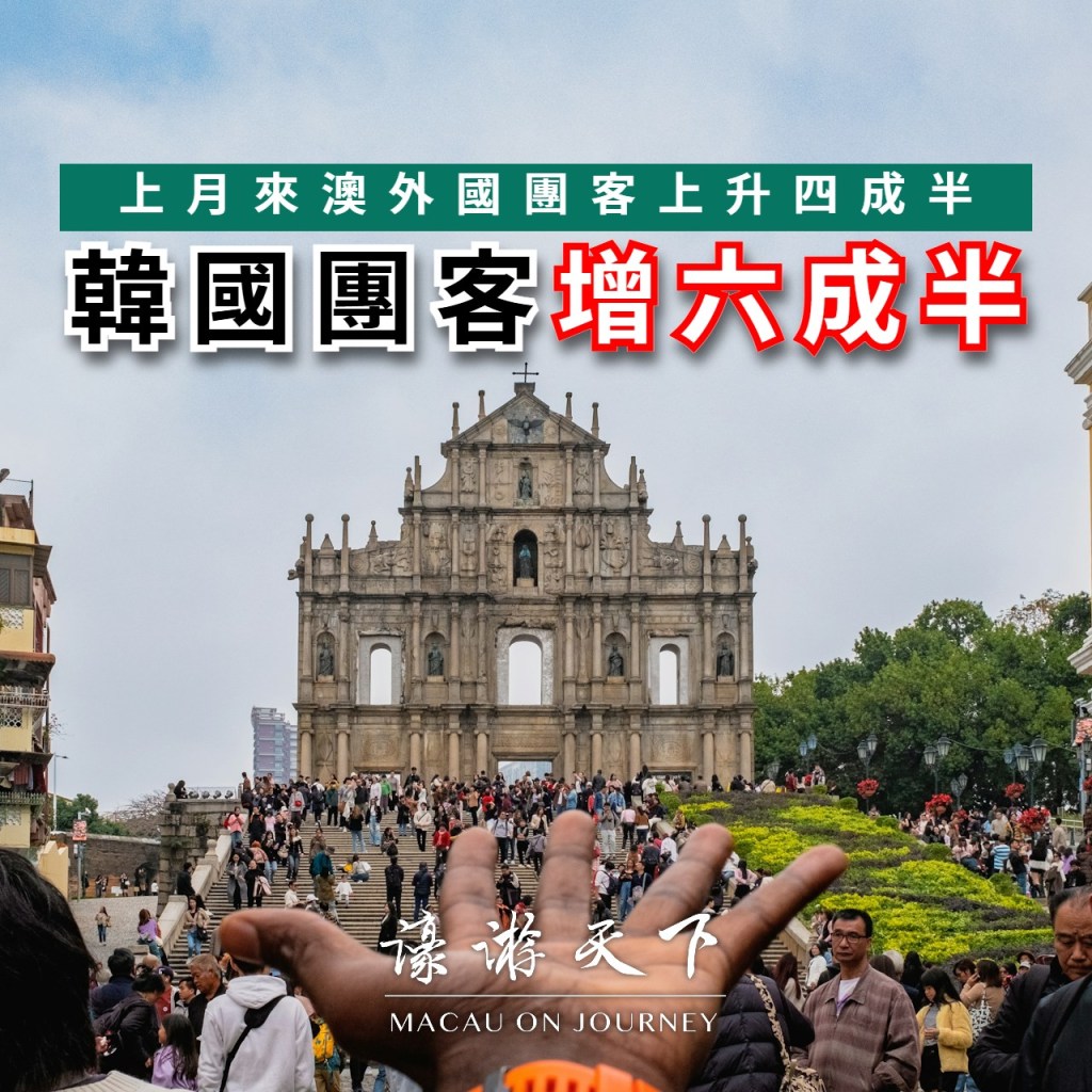 統計暨普查局公佈上月隨團入境旅客有14.5萬人次,按年增加3.8%;中國內地團客下跌0.7%,國際團客則增加44.8%,當中韓國團客上升64.8%。