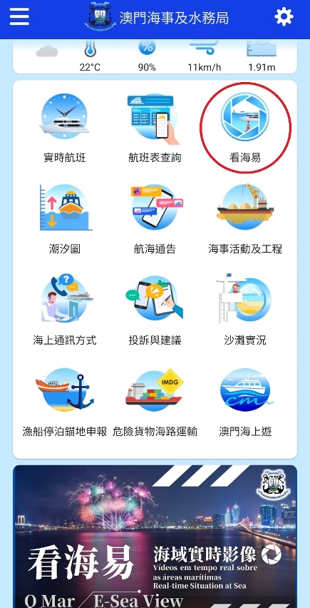 海事及水務局自2022年6月起推出「看海易」項目,開放部分海上實況影像鏡頭予公眾,有助市民和海事業界掌握澳門海域實況,並多角度了解澳門水道、內港錨地等船隻航經和停泊頻率較高的區域實況。為加強監察澳門海域,並使公眾能進一步了解澳門海域實況,海事及水務局近日在「看海易」中新增四個位置的海上實況影像鏡頭,現時共有十八個不同角度的影像鏡頭向公眾開放,部分鏡頭更可以欣賞到澳門海域不同時刻的壯麗景色,包括黃昏時分的西灣大橋、新落成的澳門大橋、繁忙的澳門水道、船隻往來的碼頭港池等。