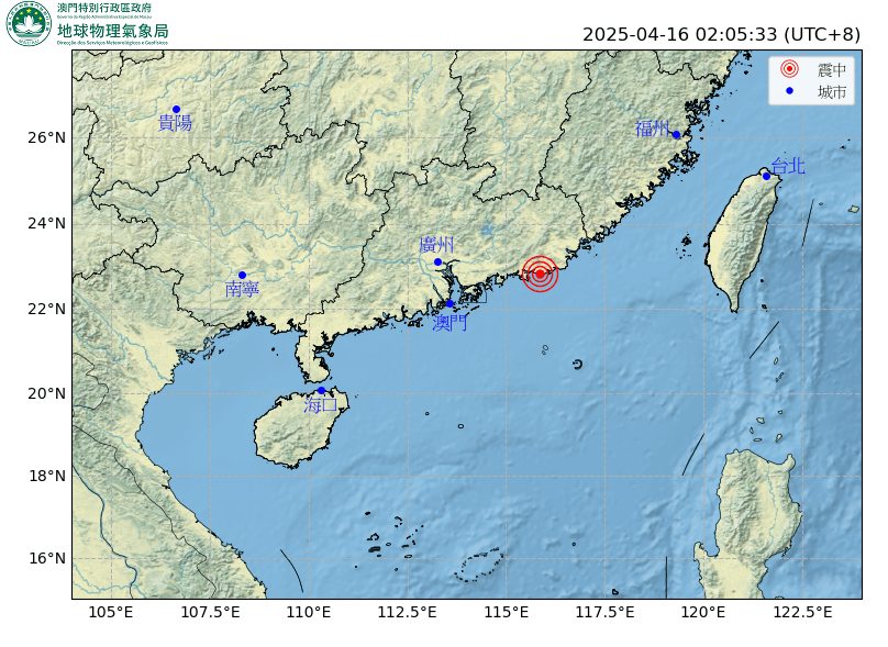 另外氣象局錄得今日凌晨2時05分33秒,於廣東汕尾市陸豐市發生3.0級地震,震源深度約為20公里,震中約位於北緯22.83度,東經115.85度,距離澳門東北偏東約246公里。