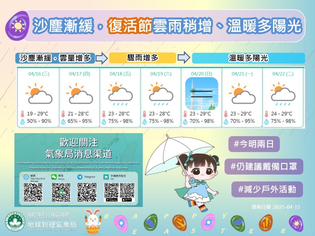 預料一道低壓槽將於本周後期影響廣東沿岸,復活節假期本澳雲量及驟雨將會增多,早晚較潮濕有薄霧:展望周末至下週初,持續受一股偏南氣流影響,氣溫會進一步上升,天氣溫暖,日間有陽光,最高氣溫可上升至30度左右。