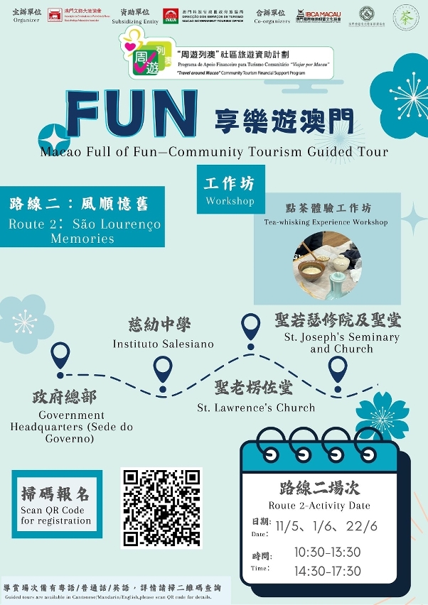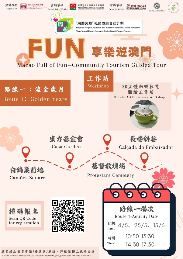 「FUN享樂遊澳門—社區旅遊駐點導賞服務」於5月4日至6月29日一連九個周日舉辦共十八場導覽。活動設三條路線:「流金歲月」路線帶領參加者深入東方基金會及基督教墳場等,探索澳門貿易發展歷程;「風順憶舊」路線讓參加者遊歷聖老楞佐堂、聖若瑟修院大樓及聖堂等,探尋澳門的獨特歷史與西方信仰;「內港昔話」路線則讓居民及旅客「穿越」到澳門工業時代,走訪廣興泰炮竹廠及8號碼頭等,了解昔日的工業與商貿故事。每場活動備有廣東話、普通話或英語導賞,亦設3D立體咖啡拉花、點茶或篆香體驗工作坊,豐富參加者體驗。