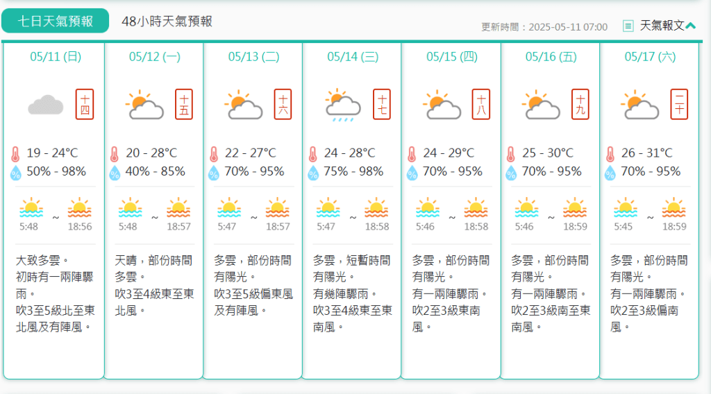 當局的天氣預報顯示,明後兩日天色好轉,最低溫介乎20至22度;星期三起多雲有驟雨,氣溫逐漸上升,星期六最高溫為31度。
