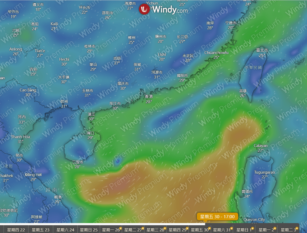 不過歐洲、德國等系統都未有作出相同預測。而根據GFS最新的預報圖顯示,5月30日南海北部並無相關強烈熱帶氣旋。
