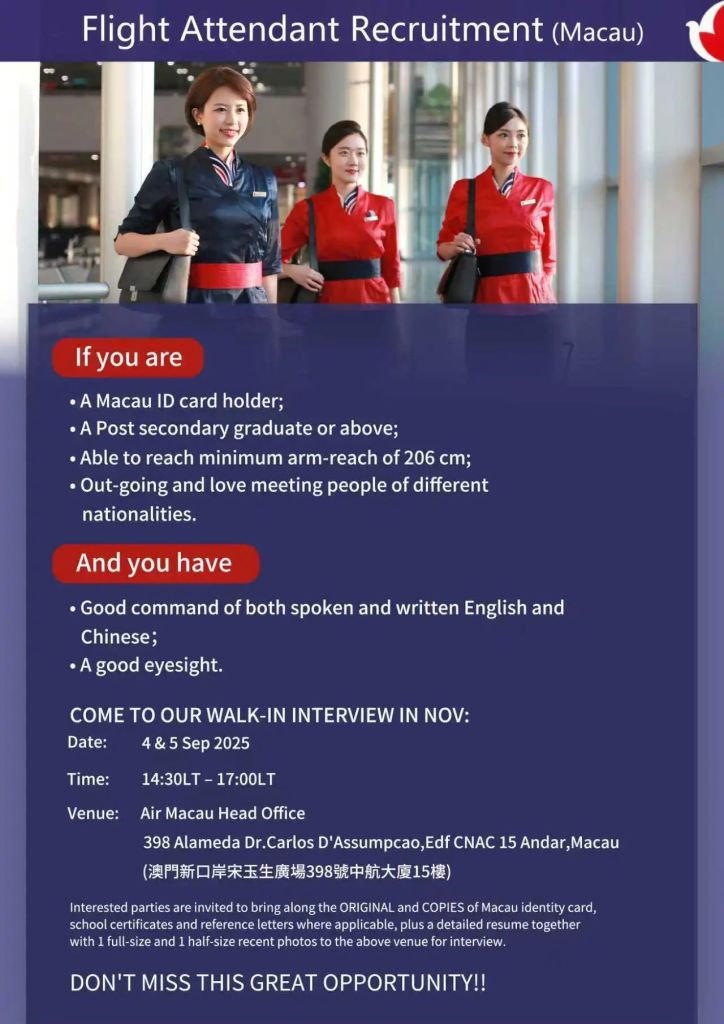 澳門航空將於9月4、5日,下午二時半至五時,假澳門航空總部(澳門宋玉生廣場398號中航大廈15樓)舉行本地空中服務員招聘會。