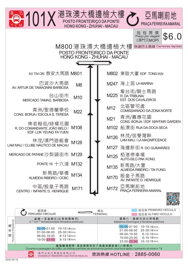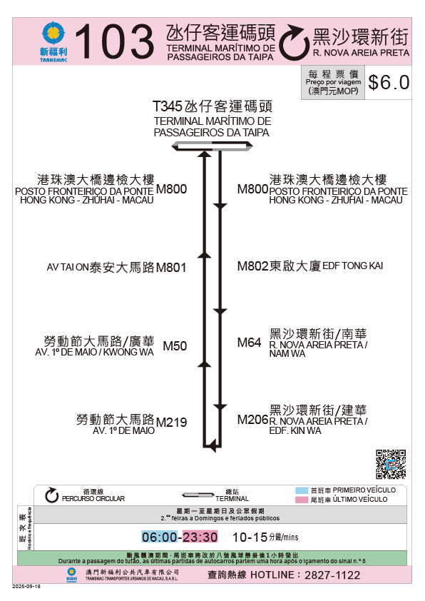 巴士服務方面,位於新城A區公共房屋附近的「泰安大馬路」站及「東啟大廈」巴士站亦會於經濟房屋辦理上樓手續的同一日(即9月18日)首班車起啟用,而101X、102X及103(原103X)巴士路線將新增停靠上述站點;當中,101X行程途經台山、新馬路及亞馬喇前地等;102X行程途經東北區、路氹和橫琴口岸等;103行程則由現時連接氹仔客運碼頭至港珠澳大橋口岸,延伸至A區及黑沙環新街一帶,透過上述路線便利前往澳門半島、氹仔、橫琴口岸等,市民亦可透過上述路線的沿途站點轉乘巴士前往其他區域。103(原103X)同時調整為一般路線票價,即澳門元3元,現金支付則為6元。此外,局方制作A區公共巴士路線的乘搭和鄰近區域的轉乘建議,供市民參考,市民亦可透過巴士報站APP的「點對點」查詢,獲取往返A區和目的地的具體搭乘方案。