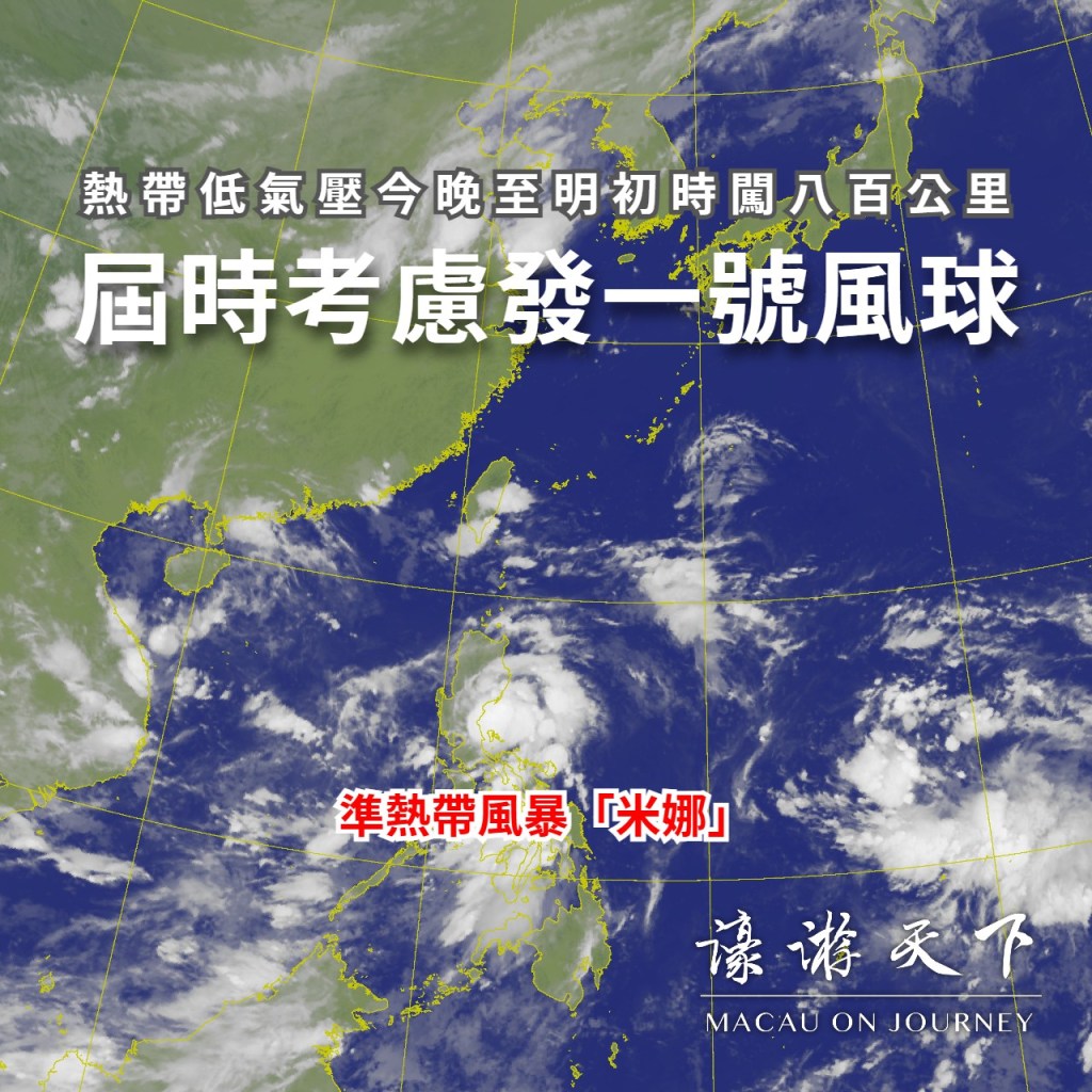 氣象局表示,位於菲律賓以東的低壓區已發展成熱帶低氣壓,今晚至明日初時將進入本澳800公里範圍,屆時會考慮發出一號風球。