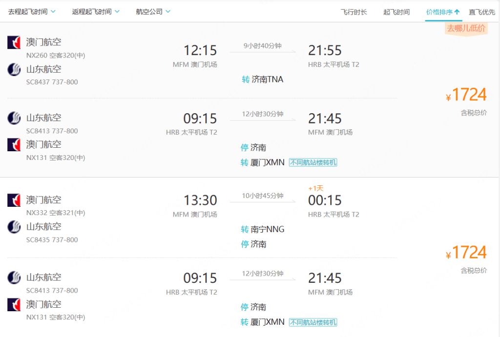 澳門航空直飛山東濟南航線剛剛開通,已經開始出現中轉航班優惠了!例如1月17日,澳門出發經濟南轉同屬國航系的山東航空前往哈爾濱,1月24日山東航空廈門轉澳門航空回程,去哪兒來回連稅人民幣1,724元(折合澳門幣約1,959元),攜程更低至1,712元。而且中轉時間分別是4小時50分及5小時20分,相對適中。另外去程經南寧轉機價格一樣,不過轉機時間較長,要次日凌晨才抵達哈爾濱。