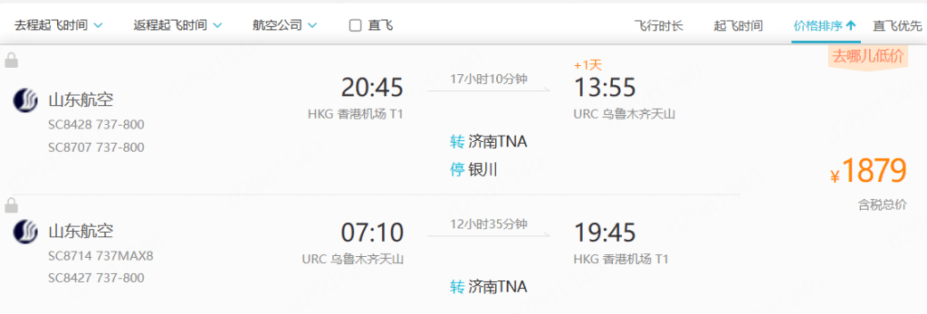 山東航空香港經濟南飛新疆烏魯木齊,連稅人民幣1,879元(折合澳門幣約2,135元)。