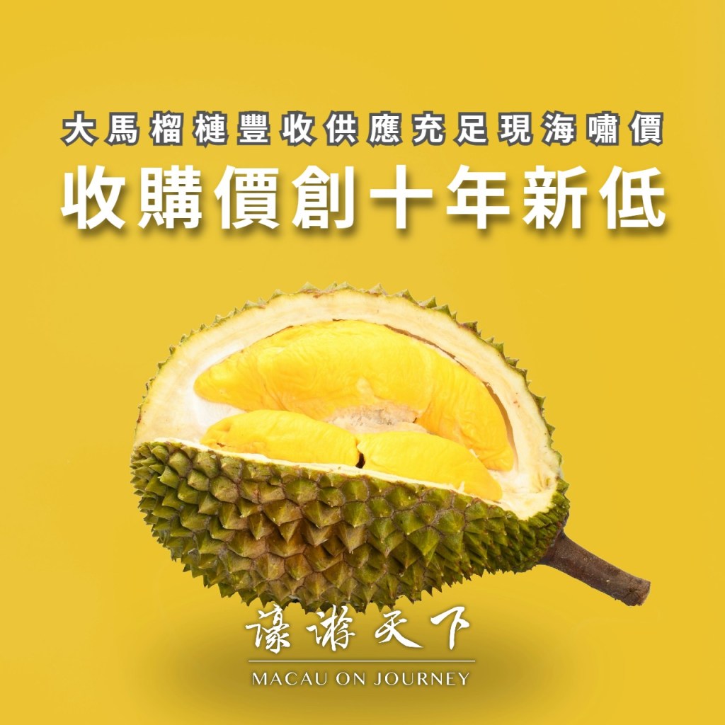 尤其知名品種貓山王價格創下十年來最低價格,本月的收購價較上個月暴跌了超過六成,彭亨州部份貓山王榴槤收購價甚至每公斤平均價在10令吉(折合約澳門幣19.8元)以下,榴槤農民及大型收果商都措手不及,榴槤剛剛有收成的新晉榴槤園主,更是叫苦連天。