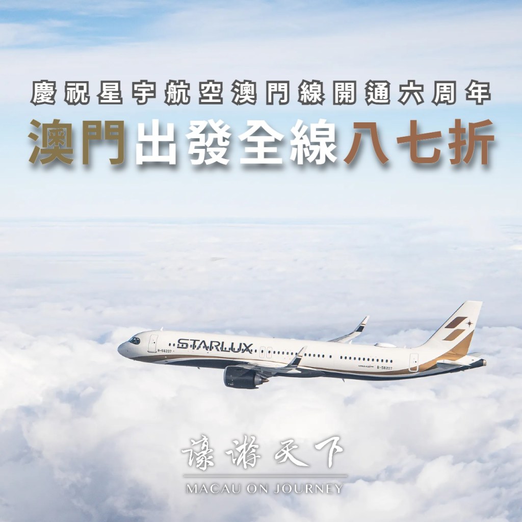 星宇航空為慶祝開辦澳門航線六周年,即日起推出澳門出發全航線八七折優惠!