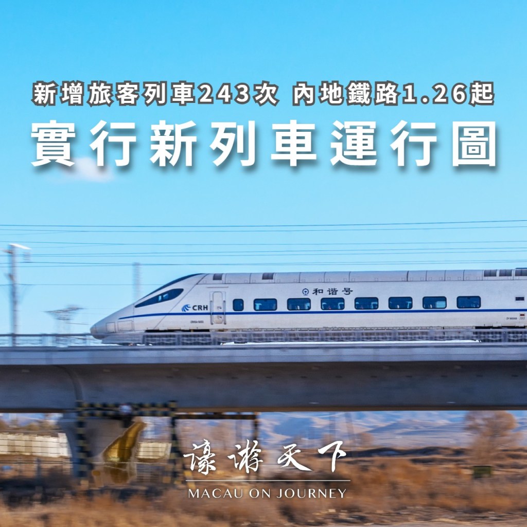 1月26日零時起,內地鐵路將實行新的列車運行圖。調圖後,全國鐵路安排圖定旅客列車12,130列,較現圖增加243列。