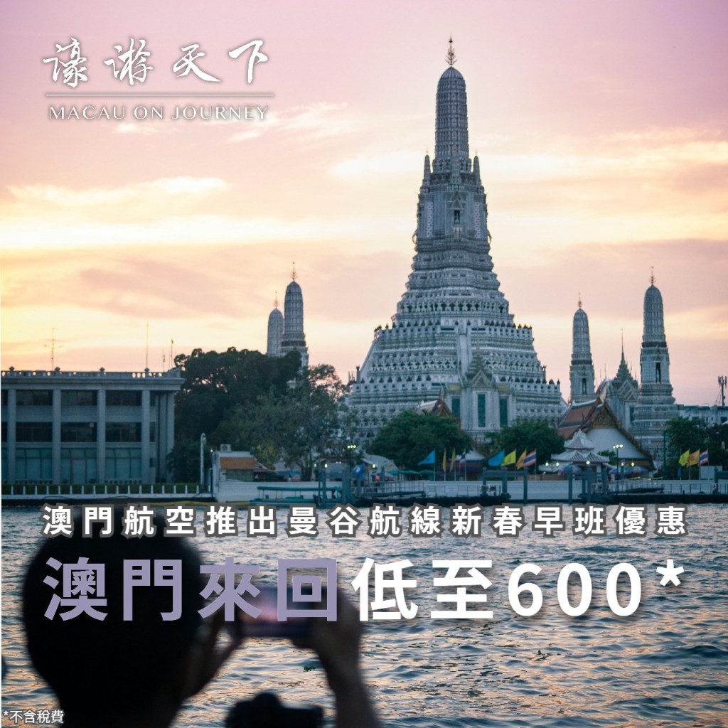 澳門航空即日起推出「春節不宅家,清晨就出發」曼谷航線新春優惠,選搭上午十時前出發航班,澳門來回低至澳門幣600元(不含稅費,回程指定NX991航班)!