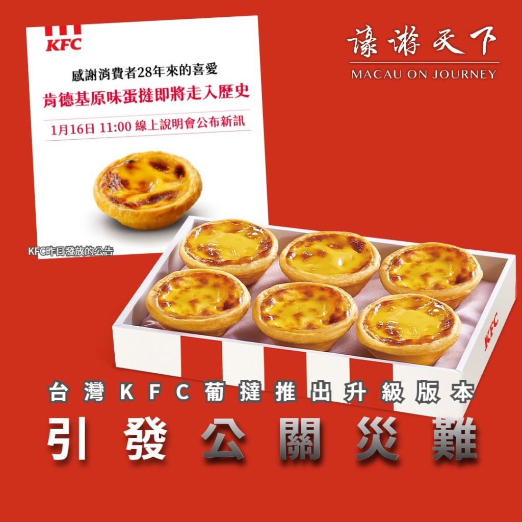昨日上午,台灣肯德基在Facebook專頁發佈聲明,指「感謝消費者二十八年來的喜愛,陪伴大家多年的肯德基經典原味蛋撻即將正式走入歷史。現有原味蛋撻將於全台門市售完截止」,並表示相關細節將於1月16日上午十一時網上說明會中公佈。