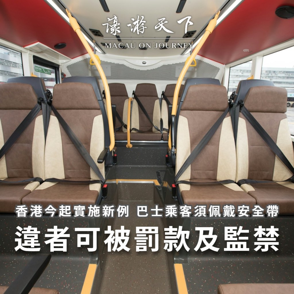 由今日起,所有新登記的公共及私家巴士的所有乘客座位,私家小巴和貨車的後排乘客座位,以及特別用途車輛的司機和所有乘客座位,均須安裝安全帶。乘坐這些車輛時,如座位已安裝安全帶,不論車輛是否新登記,司機和座位乘客均須佩戴。