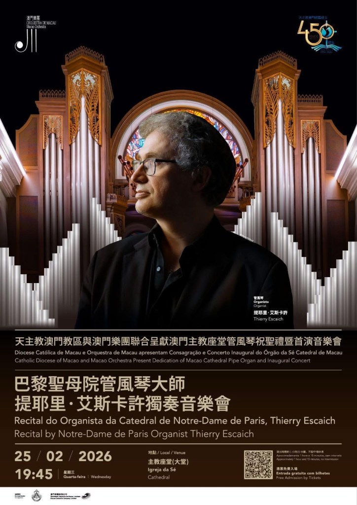 天主教澳門教區與澳門樂團聯合呈獻:澳門主教座堂管風琴祝聖禮暨首演音樂會《巴黎聖母院管風琴大師提耶里.艾斯卡許獨奏音樂會》將於2月25日在主教座堂隆重舉行。
