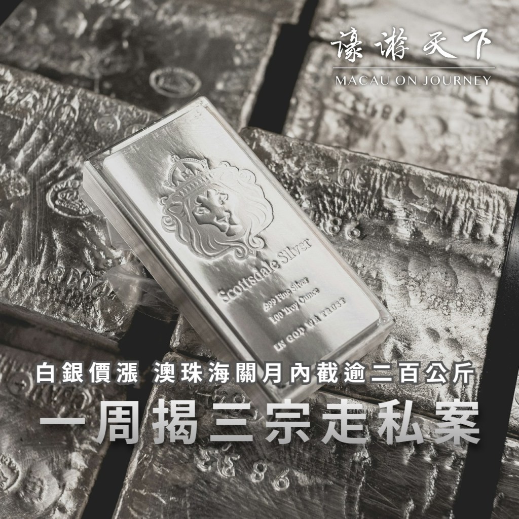 黃金與白銀近期在國際市場上的價格屢創新高,龐大利潤衍生的跨境走私犯罪也日趨活躍。澳珠兩地海關過去一個月已經截獲超過200公斤白銀。