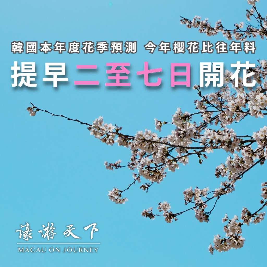 韓國氣象預測機構Weatheri早前公佈了當地本年度的花季預測,其中預料櫻花會比常年提前二至七日開花,首爾的開花日會落在4月3日。