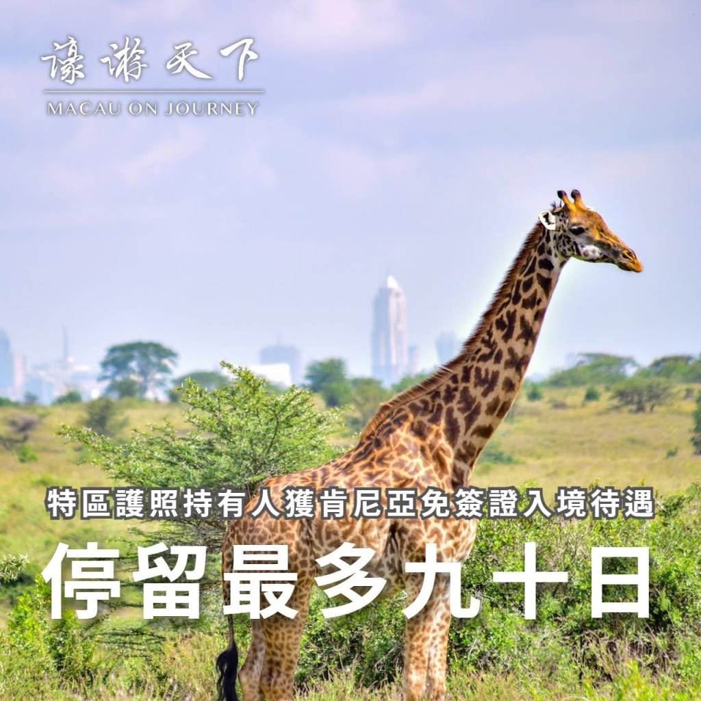 澳門特區政府接獲肯尼亞駐華大使館的通知,肯尼亞共和國政府對所有旅客(包括澳門特區護照持有人)實施電子旅行許可(Electronic Travel Authorisation,簡稱eTA)的入境措施,旅客入境肯尼亞前須申請電子旅行許可,獲審批後可免簽證入境該國,單次入境停留最多九十日。詳情可參閱肯尼亞電子旅行許可的官方網站。