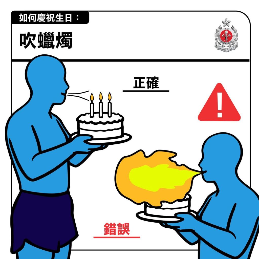近年以藍色隱形人形象介紹消防資訊深受市民歡迎的香港消防處,近日也發文提醒,指「噴火蛋糕」 極度危險,含住易燃粉末或酒精再噴向蠟燭製造噴火效果,極度容易瞬間「搶火」,有機會令事主和周圍的人嚴重燒傷,甚至釀成火警。消防處呼籲切勿為「打卡」以身犯險。