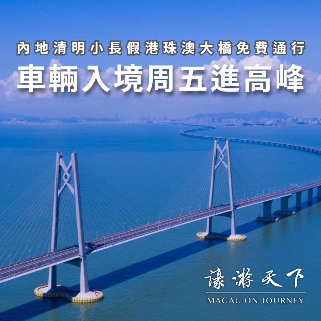 內地清明小長假期間,港珠澳大橋實施免費通行政策。當局預計,港珠澳大橋珠海公路口岸或將迎來車流、客流高峰,其中車輛入境高峰將由星期五開始。