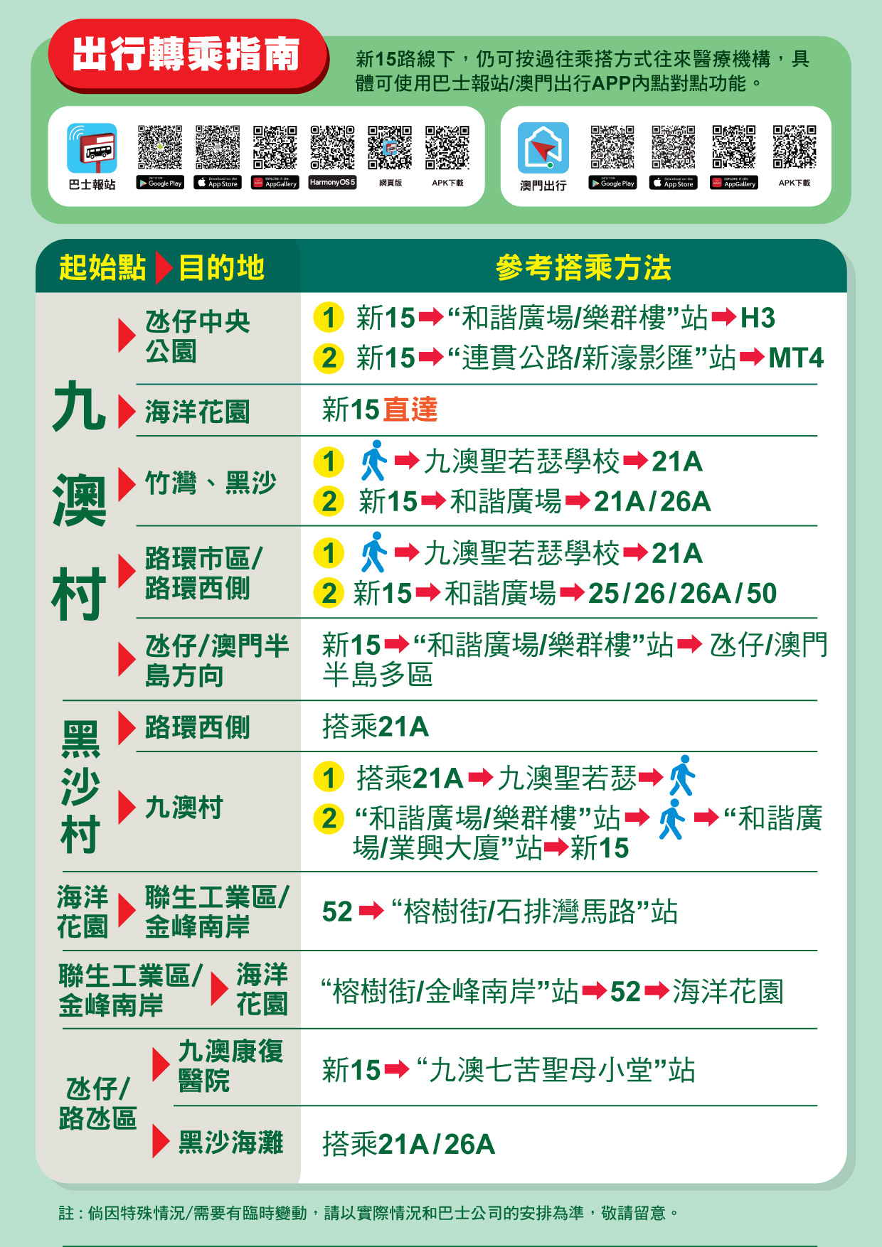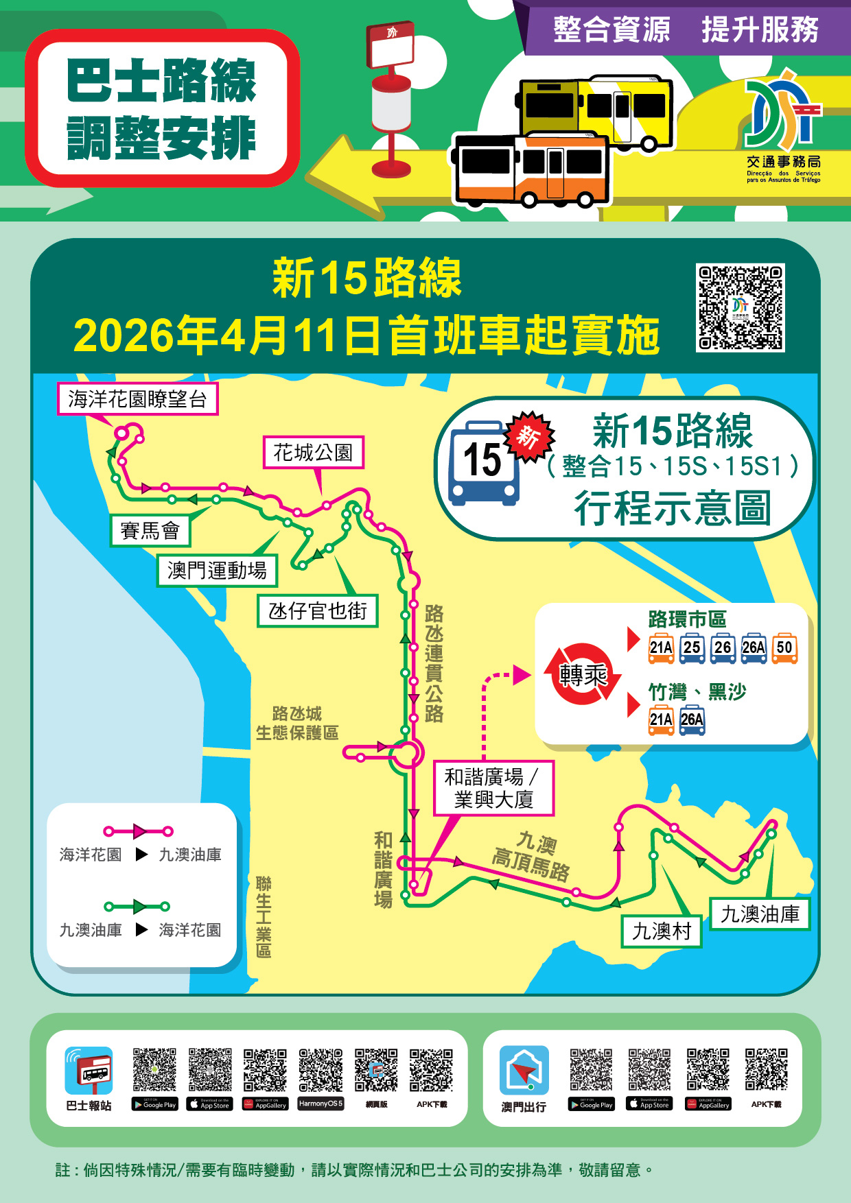 4月11日起,由現時15、15S及15S1路線合併的新15路線將以往返海洋花園及九澳村的路線運作,班次頻率將加密到22至26分鐘。當中,將新增往來九澳高頂馬路及九澳油庫的行程,同時,前往路環市區、竹灣、黑沙等區域的乘客,則可透過轉乘其他路線繼續行程。