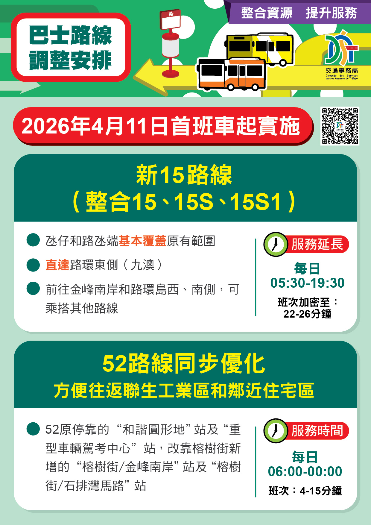 交通事務局表示,為優化公共資源配置,交通事務局持續透過數據分析客流,並與兩間巴士公司協調,推動路線重組與站點優化。4月11日起將實施新15路線的巴士服務,並調整52路線的行程,透過整合資源、加密班次、擴大覆蓋,為市民提供更便捷的巴士服務。