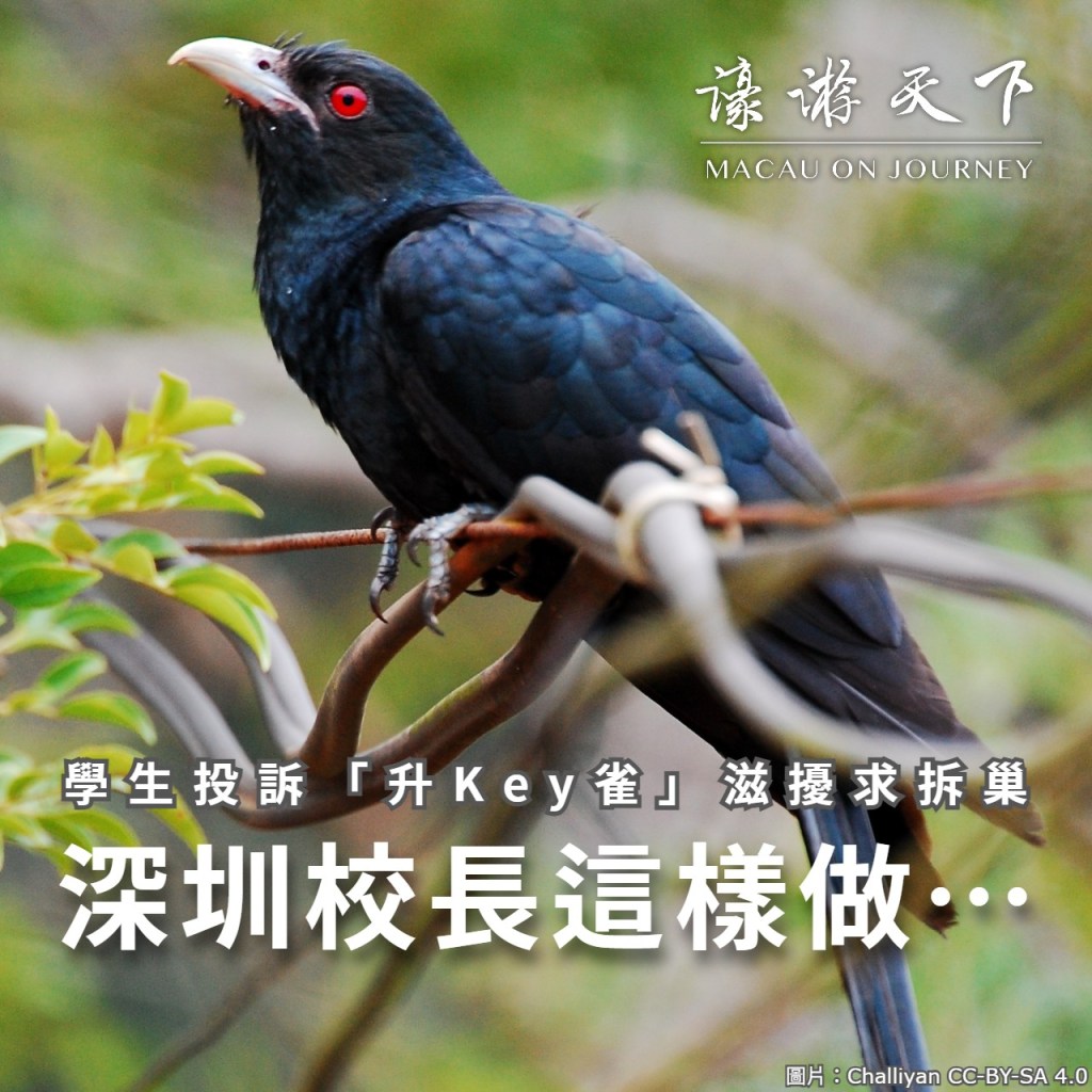 在寶安中學,一名高三學生致函校方,表示臨近高考、學習緊張,但窗外樹梢上的噪鵑「活力四射、激情啼鳴……不知疲倦」。學生指每日晚上六時半至七時十分「初是一隻,而後亂者四應,校園處處,此起彼伏」,對此「不知有何妙計」,希望「派專人拆除鳥巢」。