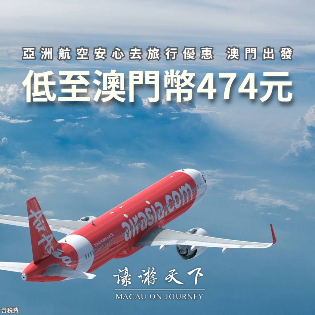 亞洲航空即日推出「安心去旅行」優惠,澳門出發單程機票票價低至澳門幣474元(含税費)!